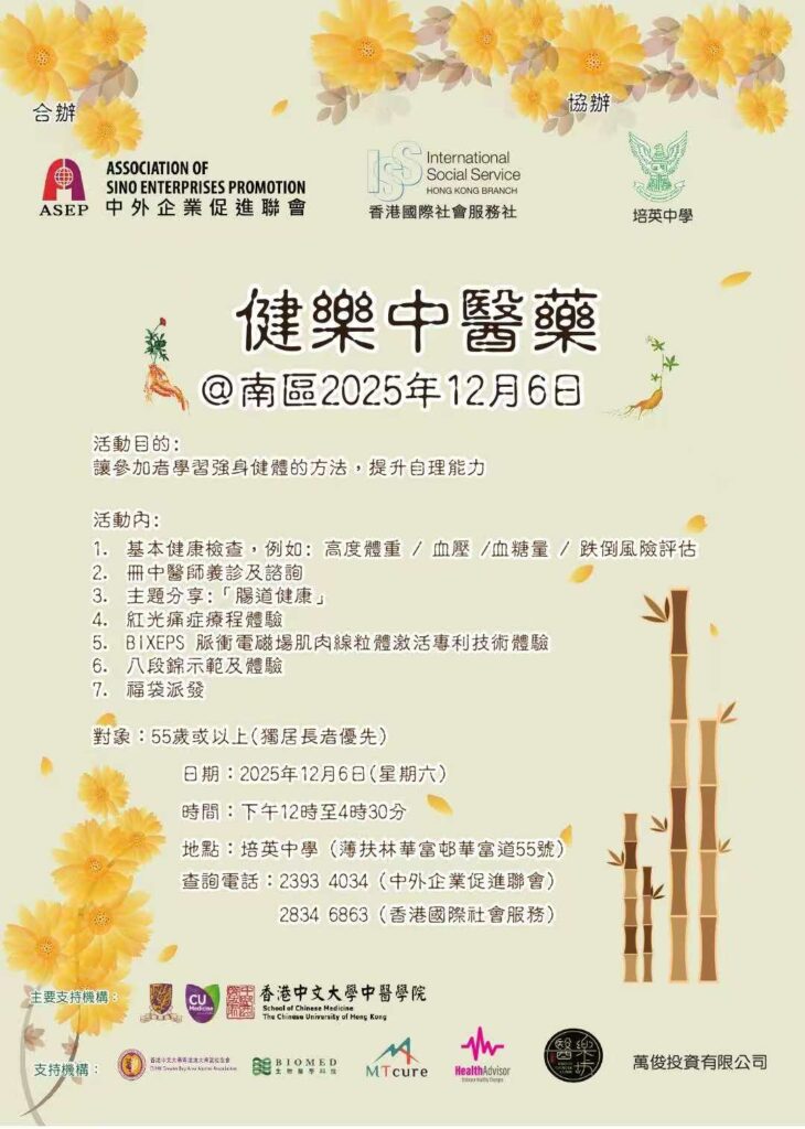 ISS國際社會服務社及中外企業促進聯會於2025年12月6日夥拍香港中文大學中醫學院和培英中學的師生們,以及一些關愛長者的機構和人士在華富為該區基層長者講解養生之道、進行基本身體檢查及中醫義診等活動,藉此鼓勵長者多關注身心健康,學習強身健體的方法,提高保健知識及自理能力,讓他們更能擁抱豐盛晚年。
